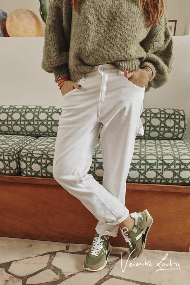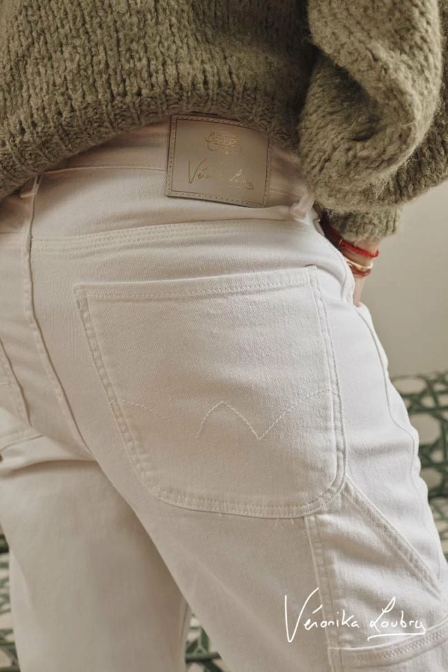 Le célèbre jeans Charpentier avec sa coupe au style worker dans sa version estivale grâce à son jeans blanc ! Sa coupe boyfit décontractée sur les hanches et resserrée aux chevilles est habillée à l’arrière par deux poches plaquées, une multipoche ainsi qu’une attache.