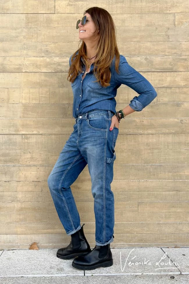 Le jeans Charpentier avec sa coupe au style worker se décline en bleu foncé ! Sa coupe boyfit décontractée sur les hanches et resserrée aux chevilles est habillée à l’arrière par deux poches plaquées, une multipoche ainsi qu’une attache.