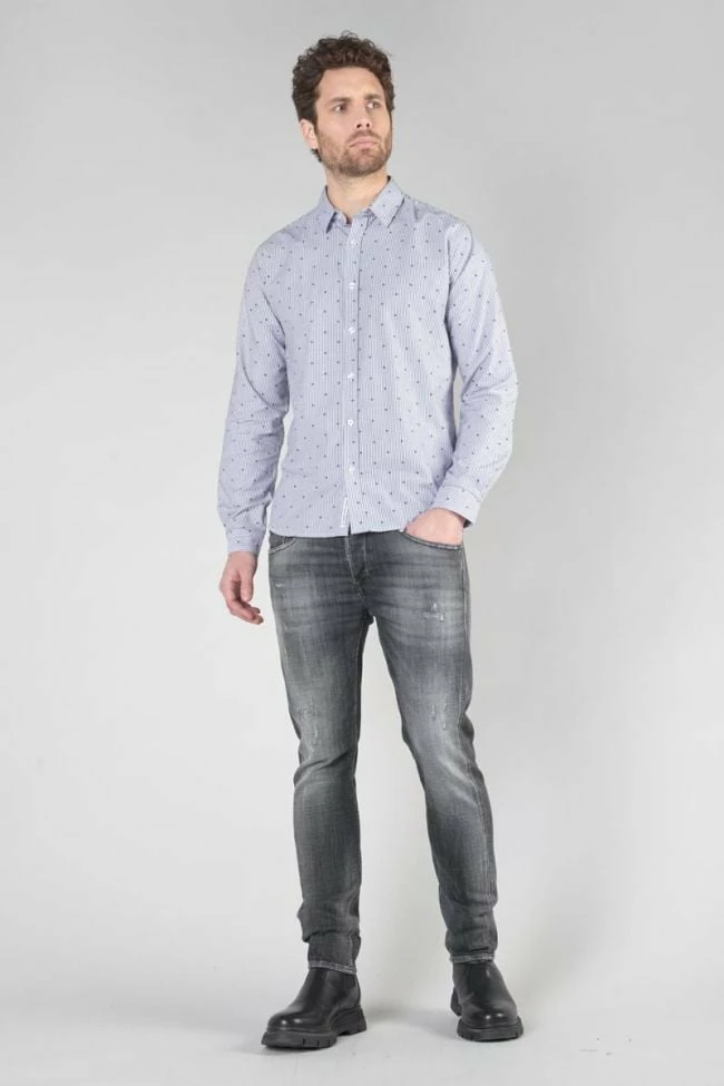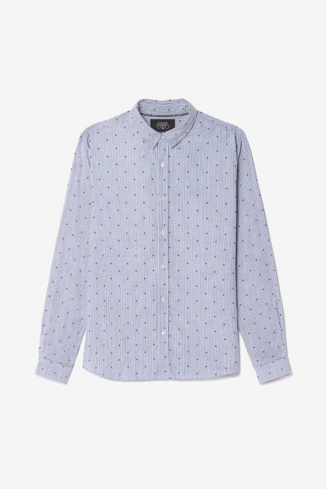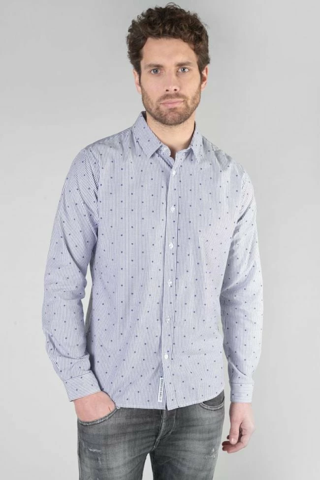 Cette chemise Stars vous donnera un look élégant avec ses fines rayures bleues et blanches habillées de petites étoiles bleues, ses boutons nacrés blancs et ses revers aux poignets avec liseré personnalisé « Le Temps des Cerises ». Pour le détail final, un mini liseré drapeau bleu, blanc, rouge dans le dos.