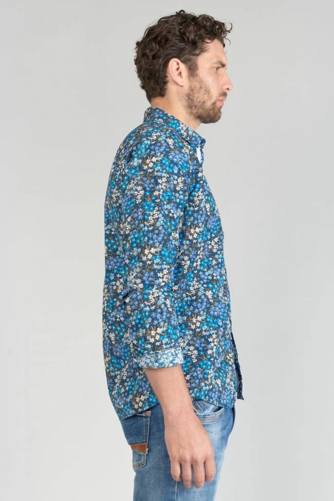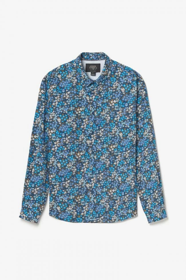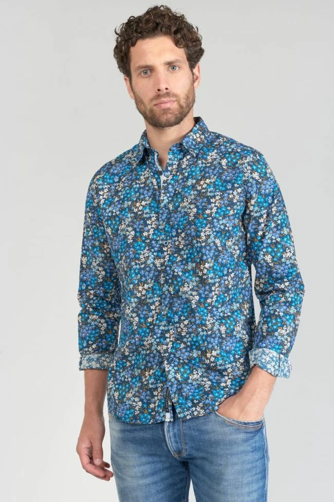Cette chemise Griba bleu nuit vous donnera un look casual élégant avec son motif fleuri dans les tons de bleu, ses boutons nacrés bleus et ses revers aux poignets avec liseré personnalisé « Le Temps des Cerises » et empiècement contrastant. Pour le détail final, un mini liseré drapeau bleu, blanc, rouge dans le dos.