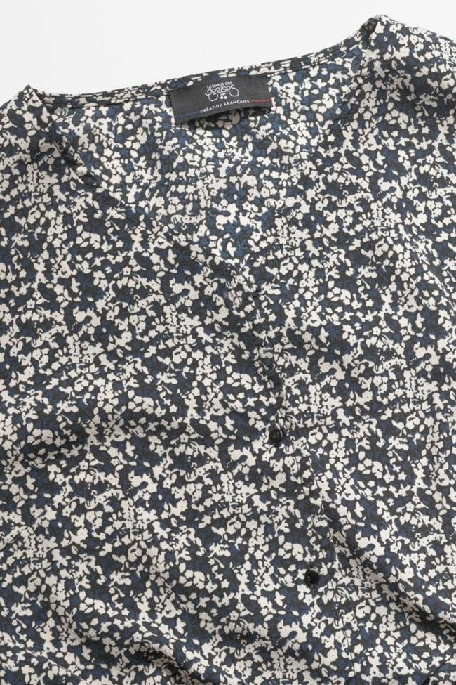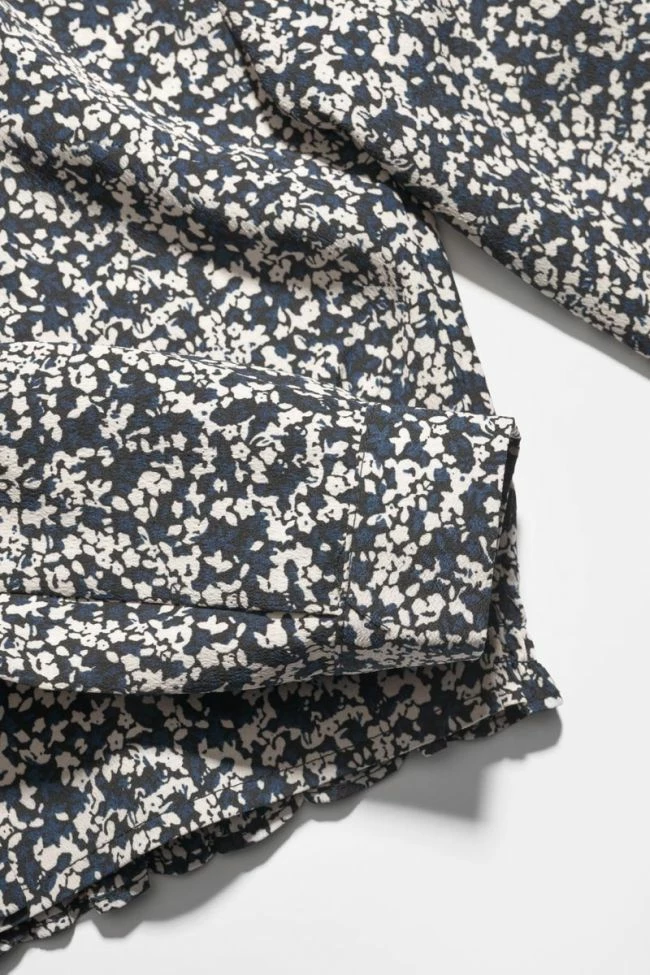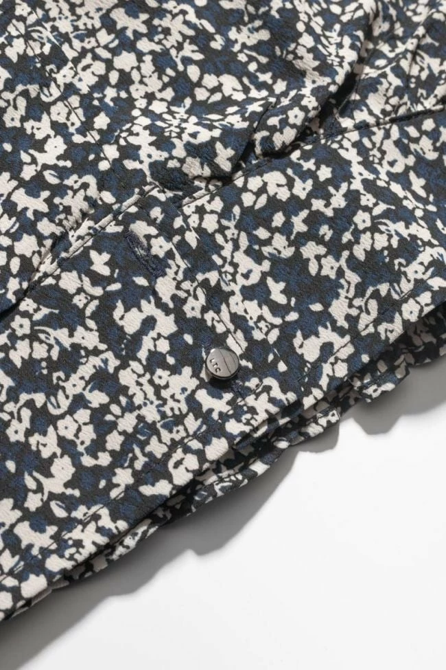 Chemise Mileagi très girly avec son motif floral bleu nuit et blanc et sa coupe courte tendance. Pour plus de confort, le tissu est fluide et léger, le bas est smocké sur le dos et la chemise se ferme à l’aide de petits boutons argentés.