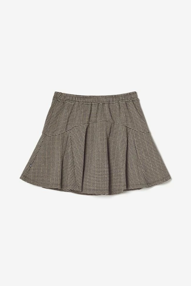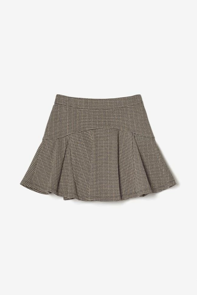 Jupe short Feligi à motif pied de poule beige et noir avec taille élastiquée au dos et tissu stretch épais idéal pour être confort durant la saison hivernale.