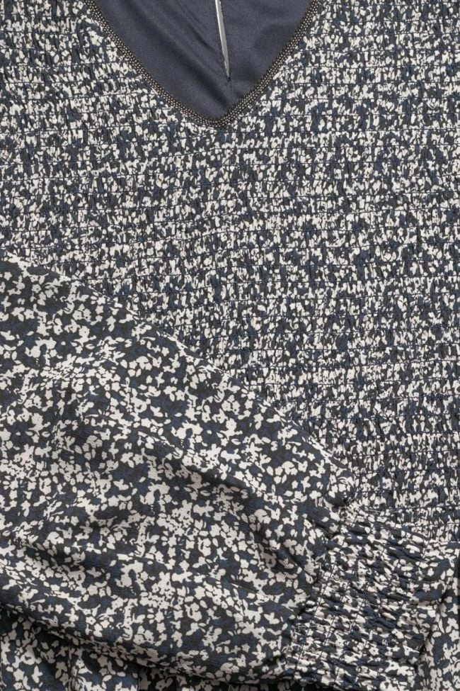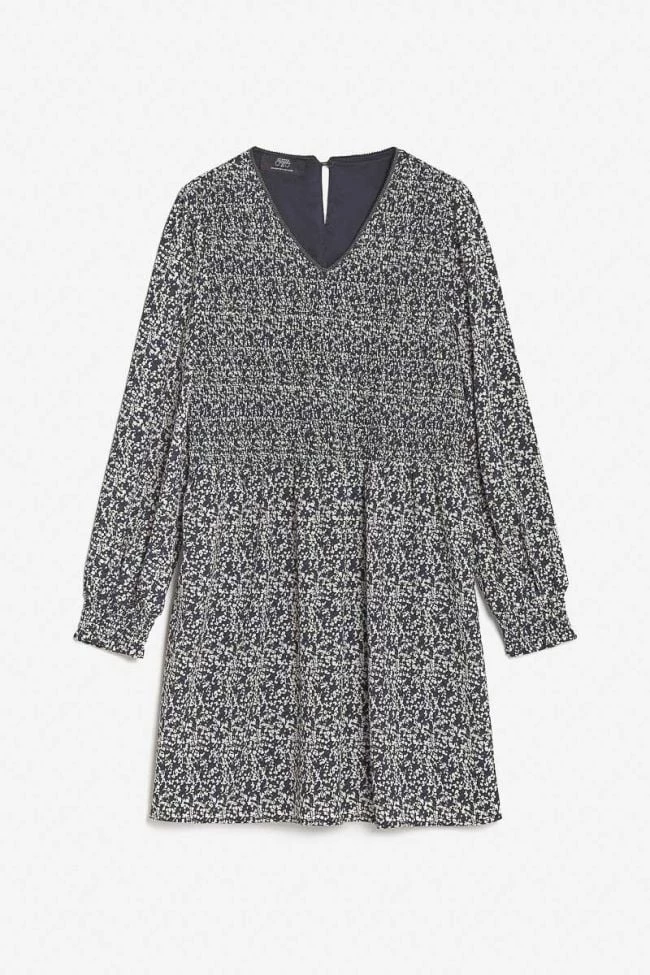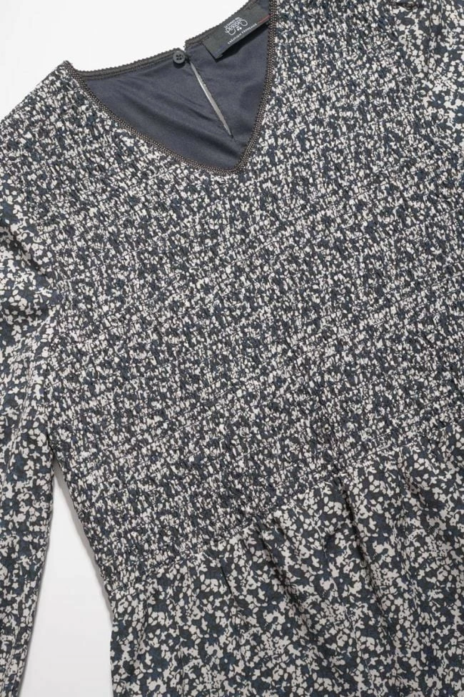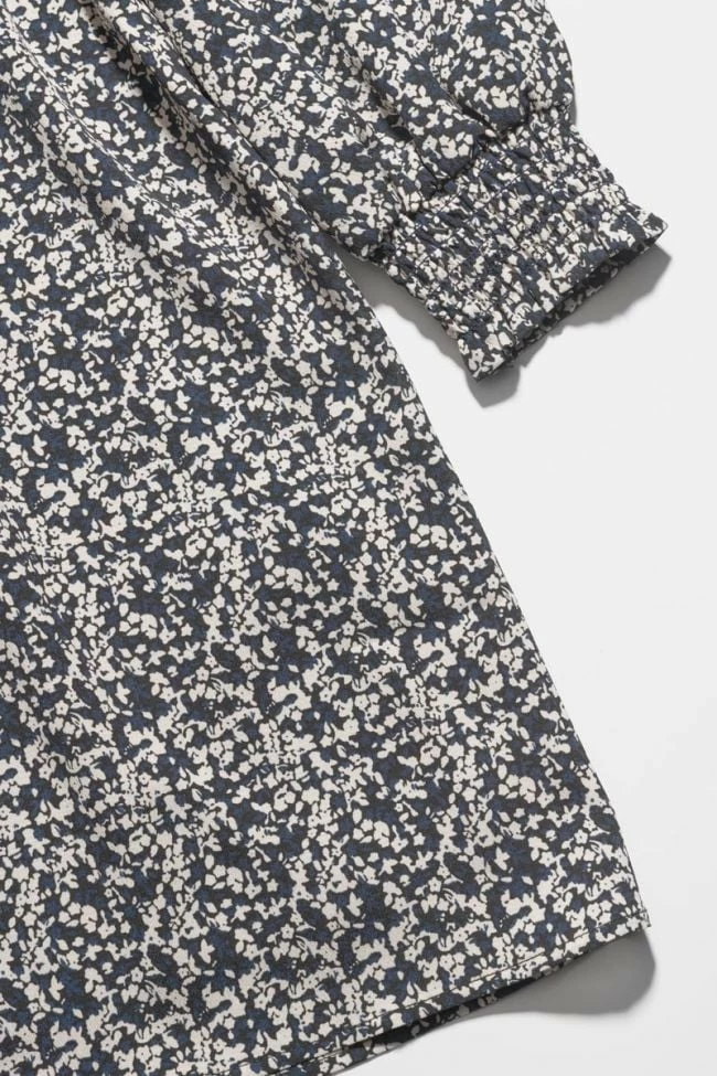 Robe Meyagi très raffinée avec son motif floral bleu nuit et blanc, son encolure habillée d’un joli liseré argenté, ses manches bouffantes et ses poignets smockés. Pour plus de confort, une ouverture goutte fermée par un bouton dans le dos et une doublure complètent la pièce.