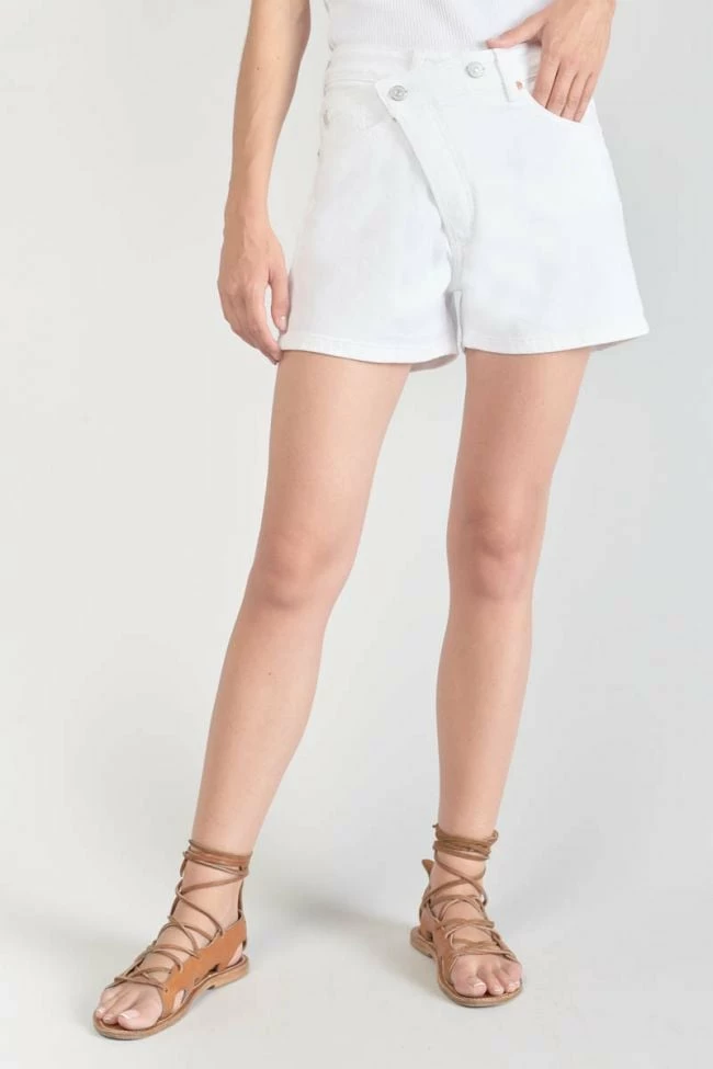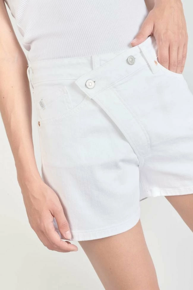 Ce short en jeans blanc est très tendance et original avec sa fermeture boutonnée asymétrique.