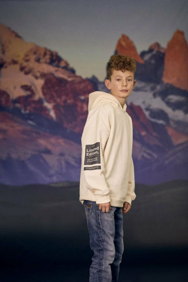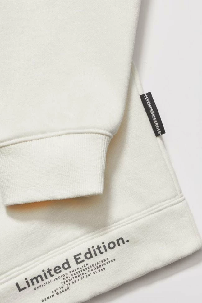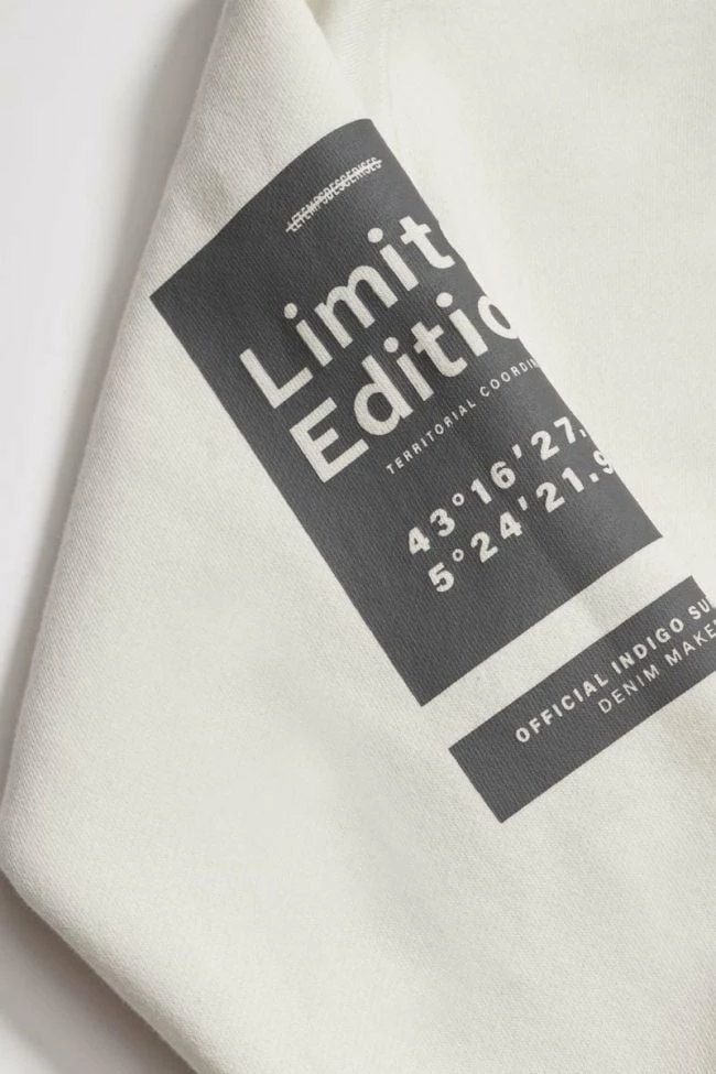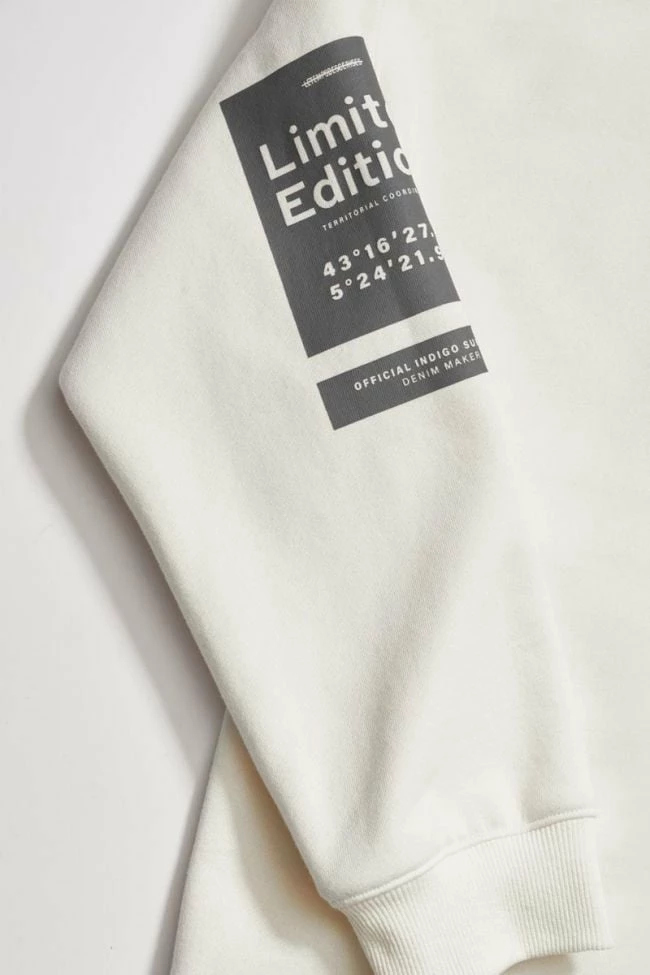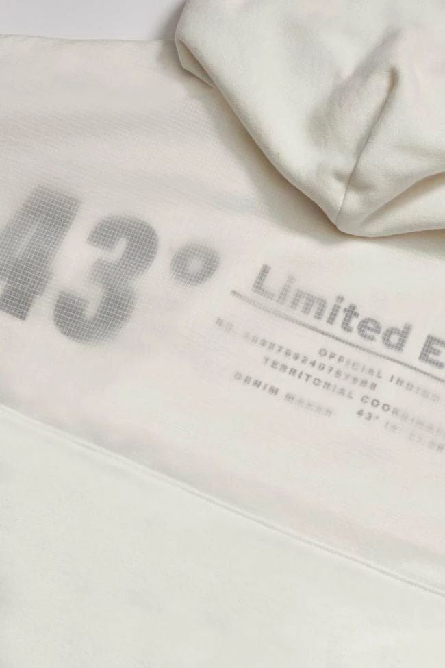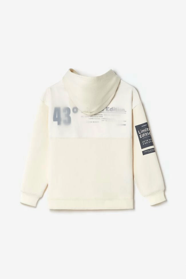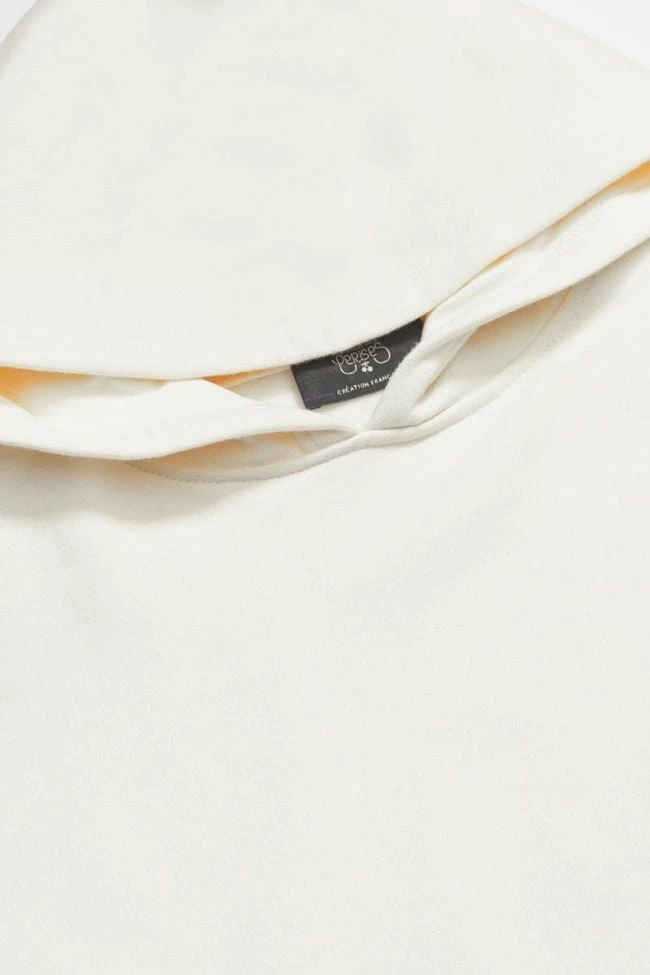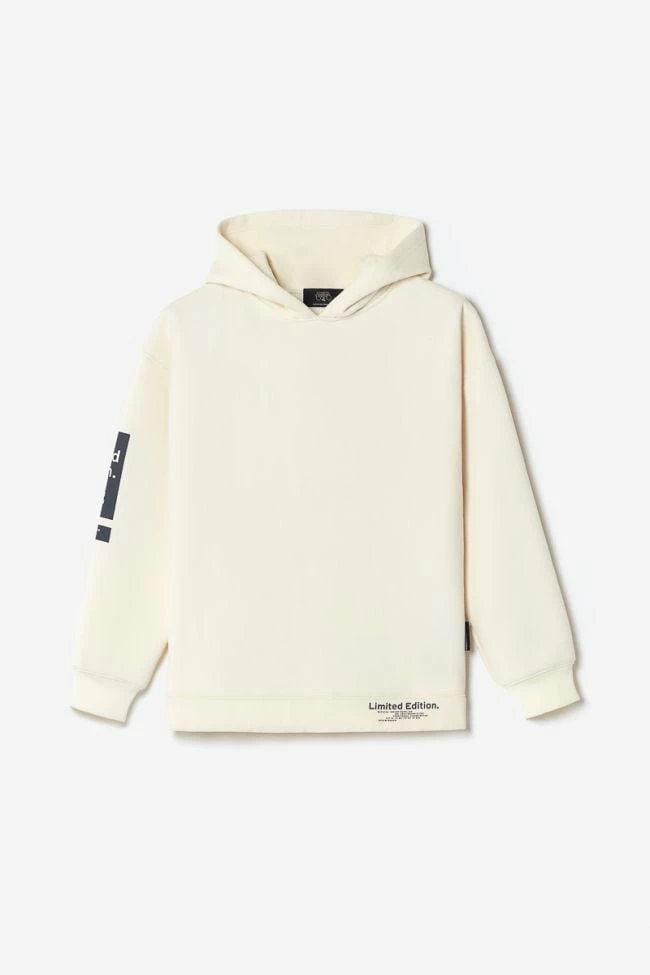 Sweat à capuche Brunobo vanille pour un look sportswear urbain avec son jeu de transparence au niveau de l’imprimé dans le dos, son imprimé gris au niveau de la manche droite et du bas du sweat.