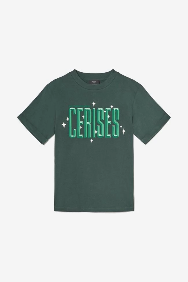 T-shirt Priahgi vert bouteille tendance et girly avec son imprimé ton sur ton Le Temps des Cerises et ses étoiles dorées. Pour plus de style, la coupe est loose et les manches sont à revers cousus.