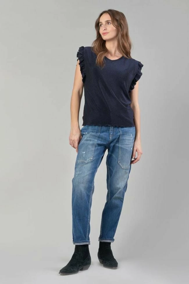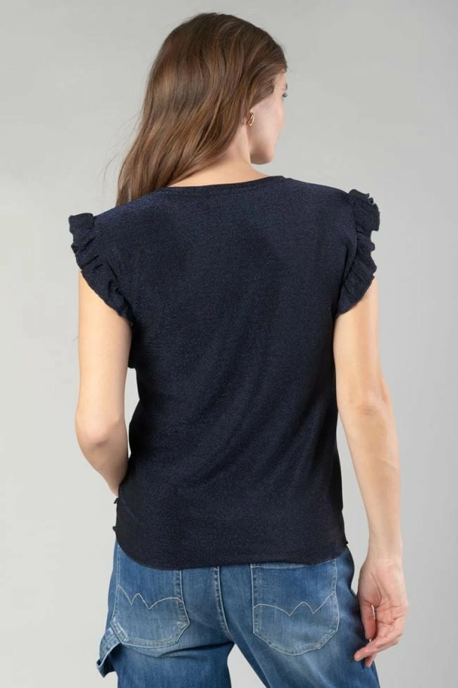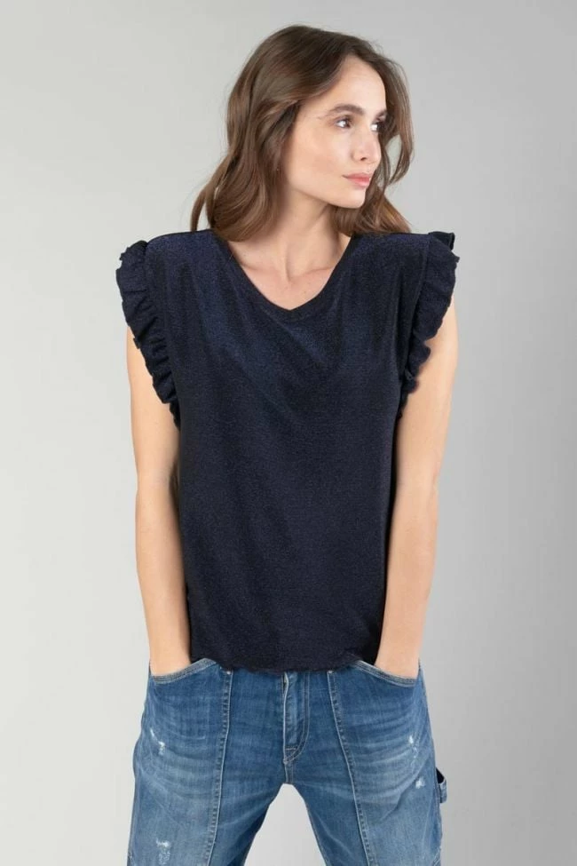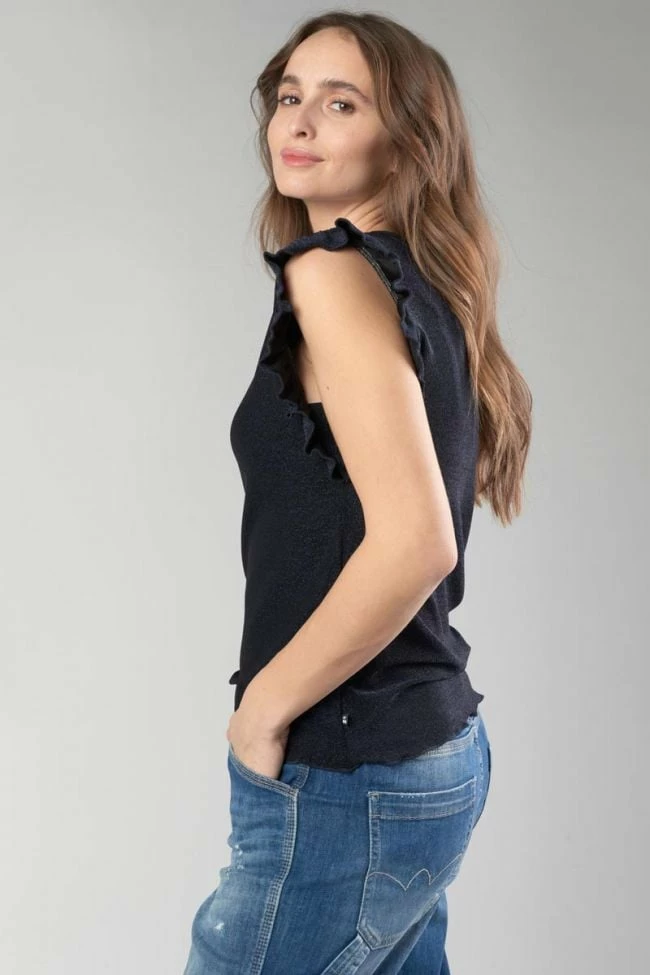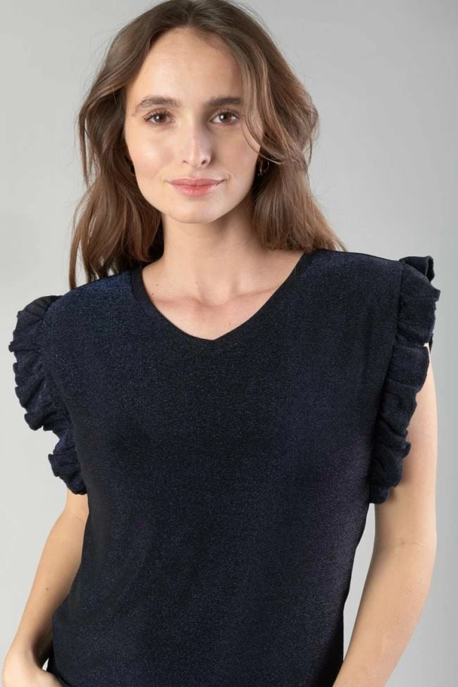 Ce top Nea sans manches, au style chic et féminin, a un tissu bleu nuit irisé, des manches très échancrées et de petits volants au niveau des emmanchures pour un côté raffiné. Pour plus de confort, le tissu est doux côté peau.