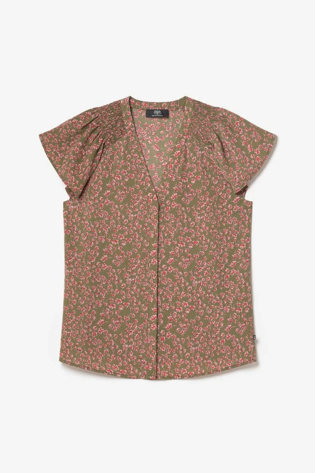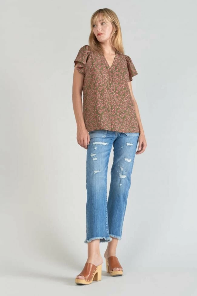 Ce top Norine kaki apportera une touche féminine à votre tenue avec son motif fleuri rose, son col V et ses manches à volants avec épaules smockées. Pour plus de confort, la patte de boutonnage est invisible.