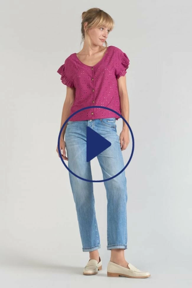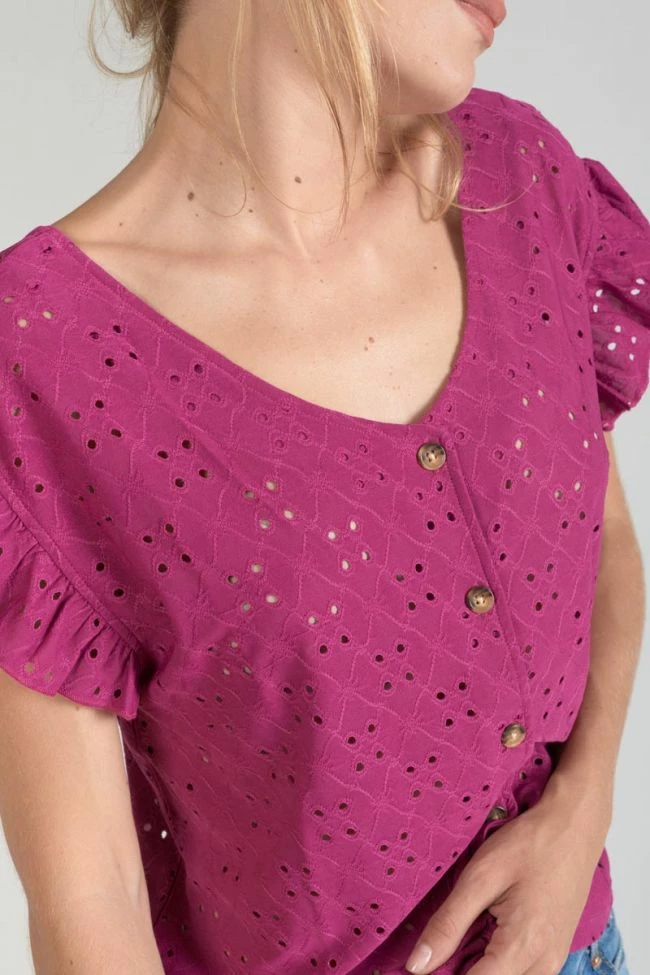 Ce top Pedrina violine ajouré en broderie anglaise est féminin et raffiné grâce à ses détails comme ses volants sur les manches ainsi que ses boutons qui ajoutent le côté chic au top.